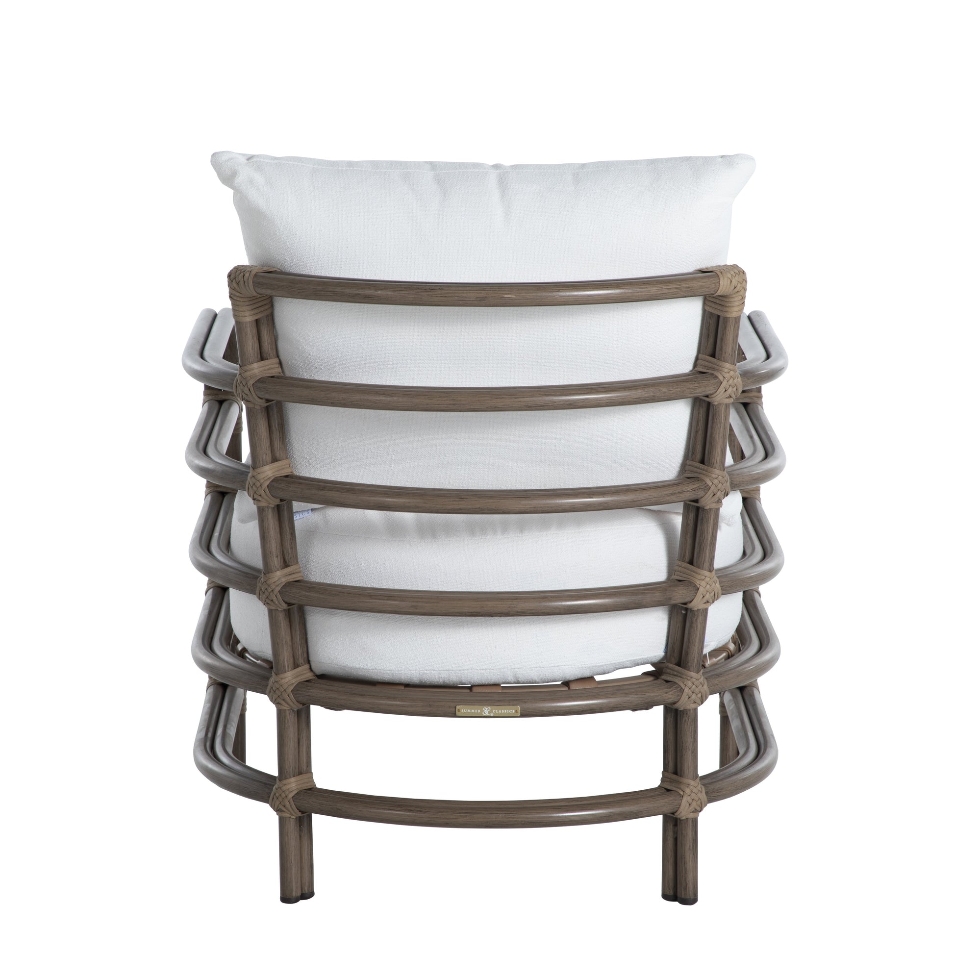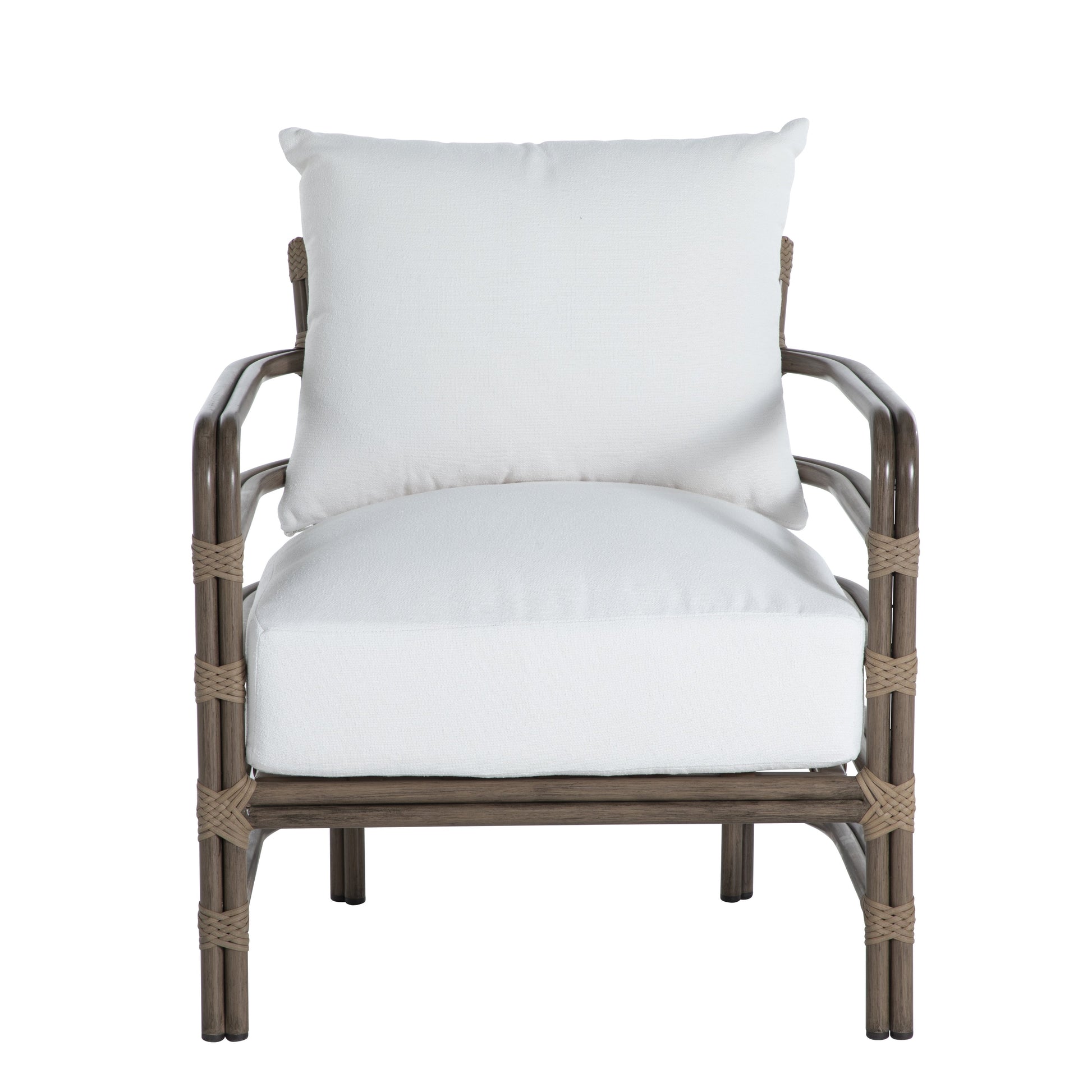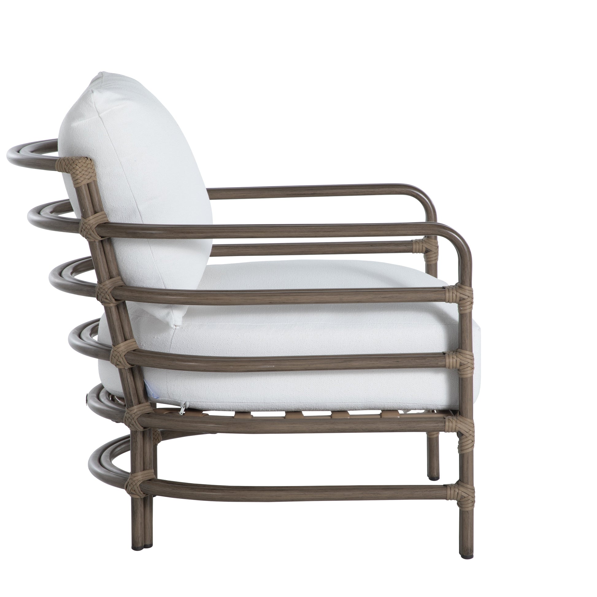 Inspired by the vintage look of natural rattan, the Malibu collection mixes materials for a modern, minimalist take on outdoor furniture. The Malibu Barrel Chair is crafted with premium wrought aluminum paired with N-dura™ resin wrapping, which creates a dramatic interplay between the oak and burlap finishes.