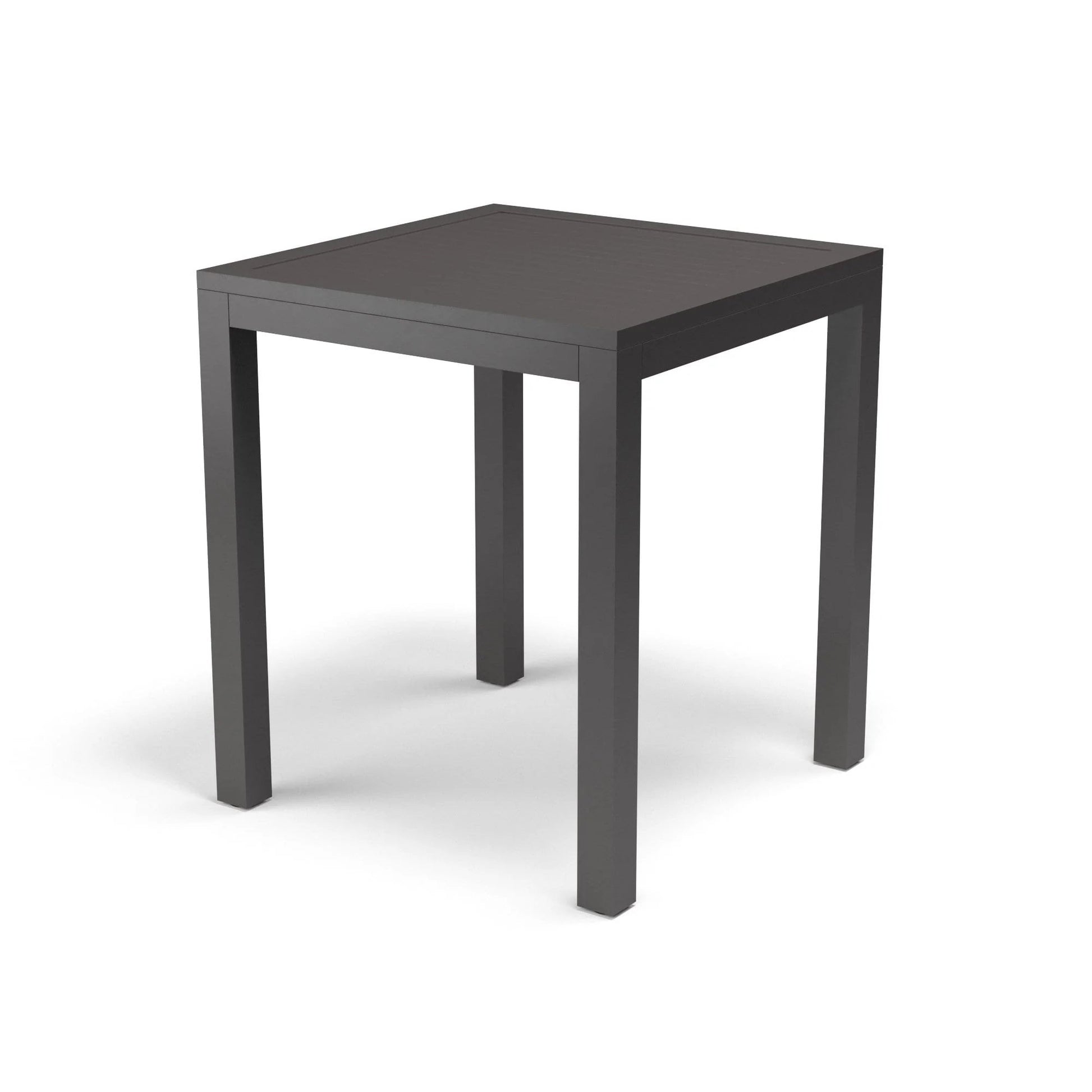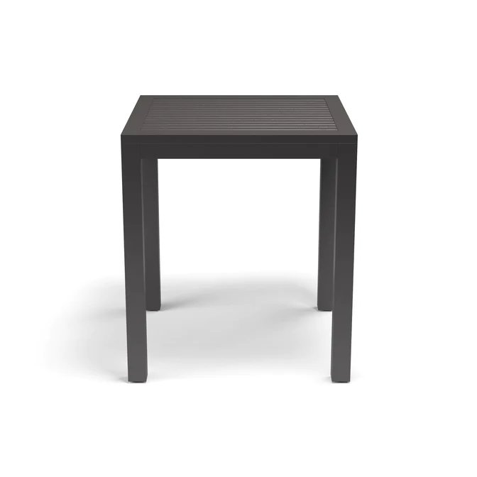The Vista Collection offers ease of outdoor dining and entertainment with its low maintenance sling and aluminum frame. The Vista Pub Table is crafted in a scratch resistant Graphite finish, on a powder-coated aluminum frame and features a slatted table top and umbrella hole.